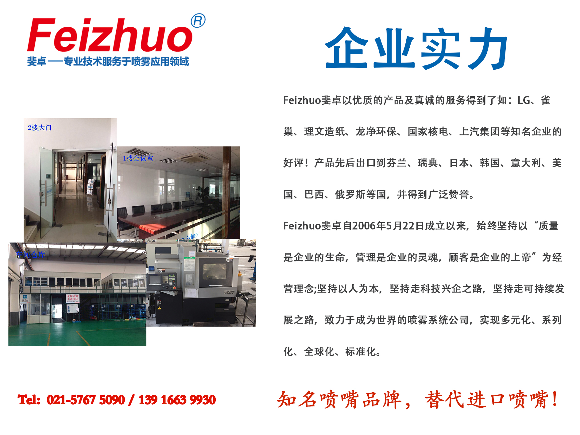 上海噴嘴廠家直銷,上海斐卓噴霧系統(tǒng)公司!公司以工業(yè)噴嘴的設(shè)計研發(fā)、替代進口,集噴霧集成系統(tǒng),脫硝噴槍及泵站系統(tǒng)等于一體化制造銷售!采用工廠直銷模式,降低中間商成本,大程度的讓利給客戶!Feizhuo斐卓追求高品質(zhì)的同時,注重噴嘴產(chǎn)品的高性價比,讓我們的噴嘴在質(zhì)量和性能上替代進口的同時,大大降低客戶的使用成本!Feizhuo斐卓噴嘴產(chǎn)品種類齊全,有9千多種類型噴嘴供各行業(yè)客戶選擇!并為客戶提供按需求定制噴嘴及噴霧系統(tǒng)產(chǎn)品的需求!